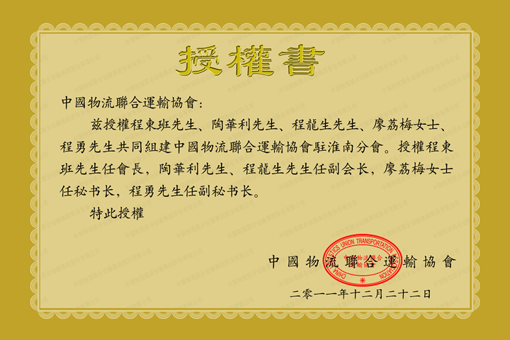 中国物流联合运输协会淮南分会授权书